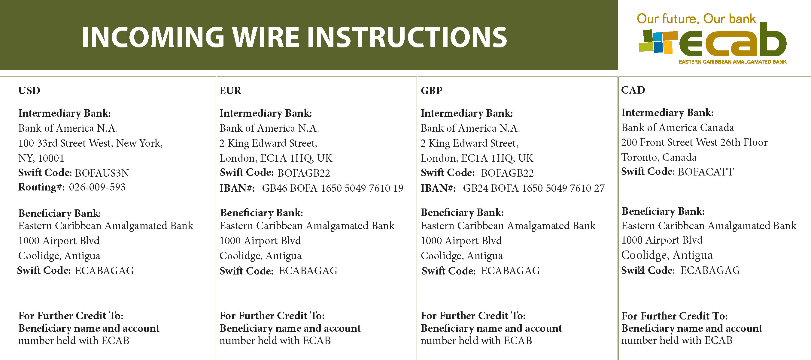 Yes. Please note that as of January 23, 2023, the use of swift code ECABAGAG001 will be discontinued and must be replaced with ECABAGAG. Please update your incoming wire instructions with the following details: